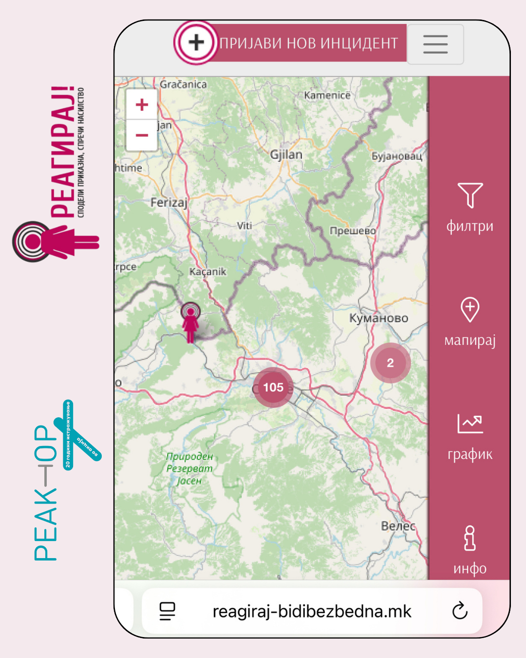 Jавната безбедност е основно човеково право. Затоа ја создадовме „Реагирај – Биди безбедна“, иницијатива против насилството кое им се случува на девојчињата и жените на јавните простори во земјава. Со помош на новите технологии и анонимноста која ја нуди оваа страна, собираме податоци за вознемирувањето и насилството кое го преживуваат жените и девојчињата, а кое често поминува непријавено и премолчено. Крајната цел е прибраните податоци да ги информираат релевантните институции за локацијата, фреквентноста и видот на насилство кое се случува и на тој начин ќе придонесат кон побезбедни јавни простори.