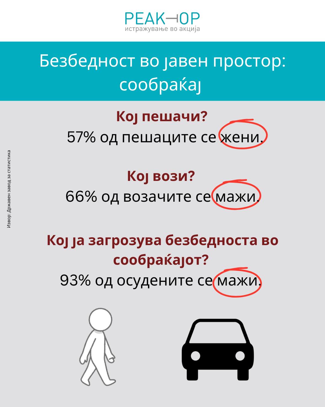 Кога јавните простори – вклучително и улиците – не се безбедни, не се работи за случајност. Небезбедноста е симптом на систем во кој оние кои се под ризик (жените пешаци) имаат најмалку контрола врз сопствената безбедност, а оние со најголемата одговорност (мажите возачи) не сносат последици за сопственото однесување.