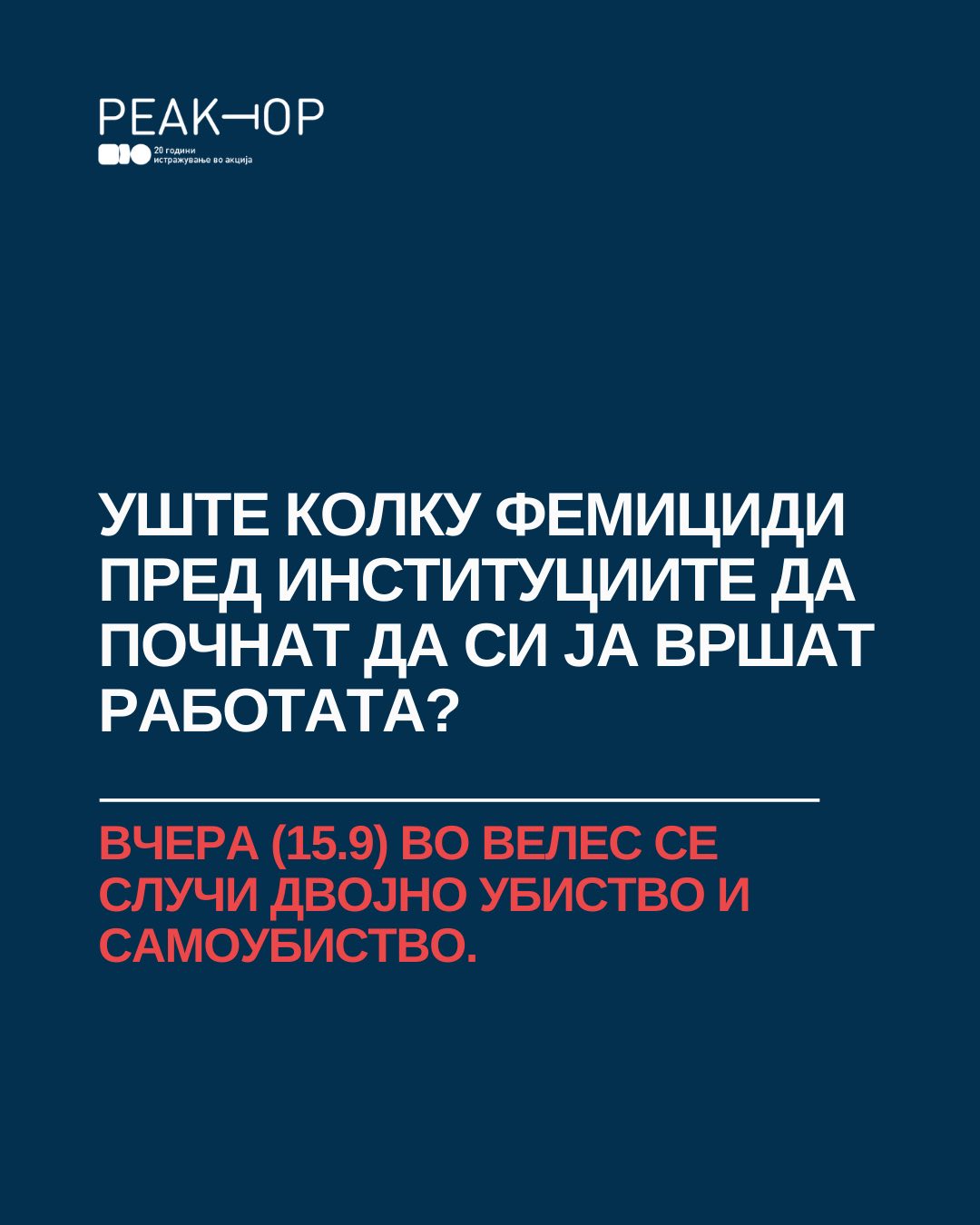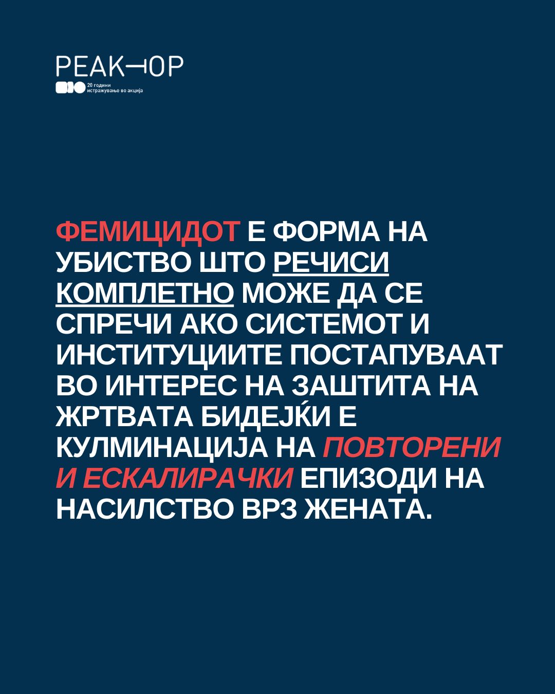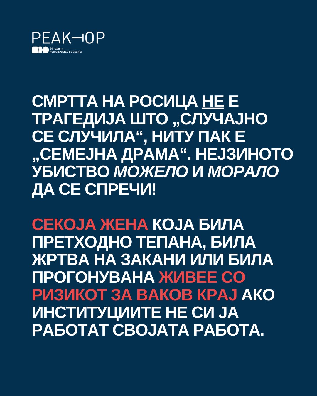 Фемицидот е кулминација на мизогинија, на општествена култура што ја зема женската жртва „здраво за готово” и очекува жените да трпат, да ќутат и да бидат послушни кон системот што ги третира нашите животи како потрошна роба, а нашата безбедност како товар.